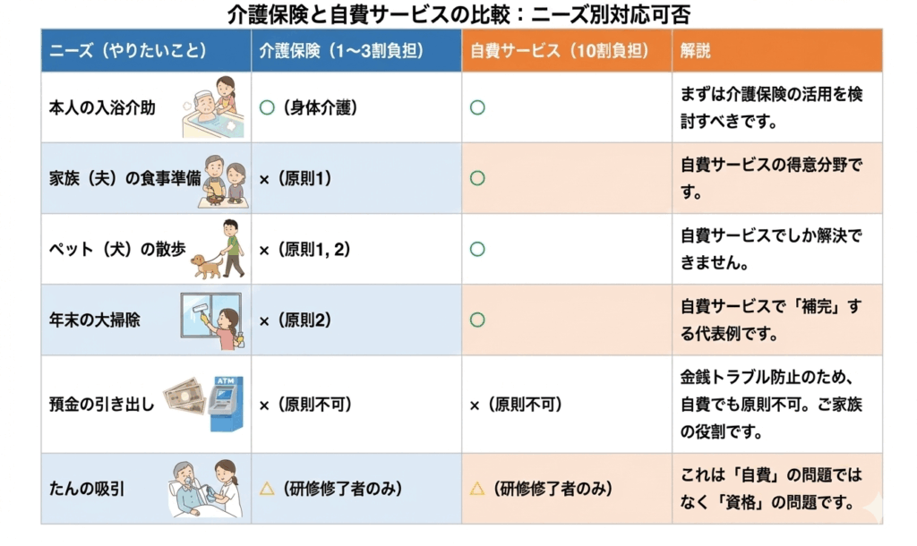 | 年末の大掃除 | ×(原則2) | 〇 | 自費サービスで「補完」する代表例です。 |